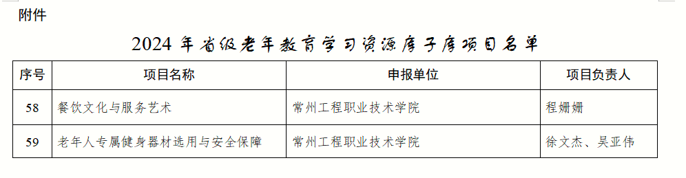近日,江苏省教育厅正式公布了2024年老年教育学习资源库子库项目入选名单,常州工程职业技术学院的“餐饮文化与服务艺术”、“老年人专属健身器材选用与安全保障”两个项目脱颖而出,成功入选该名单。